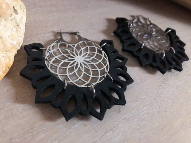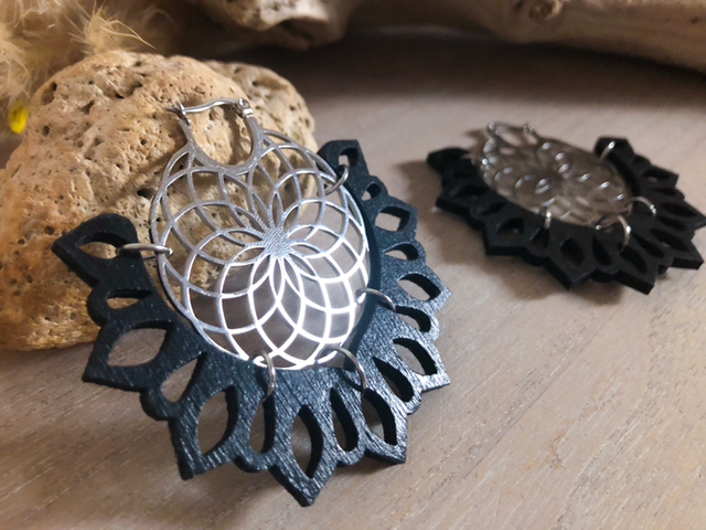 • Pendentif en bois: design entièrement dessiné par mes soins (tous droits réservés) Découpé à la machine laser.