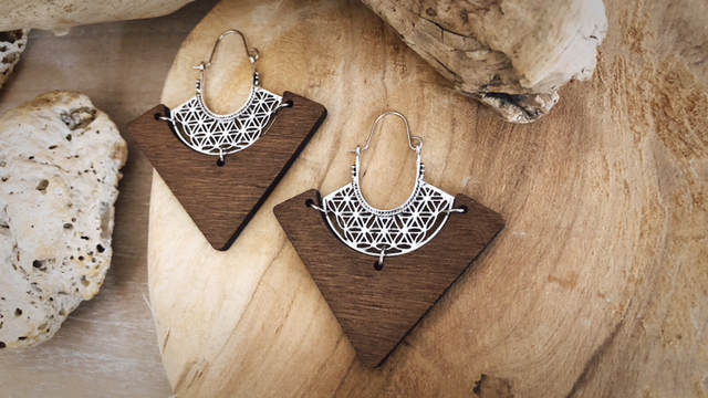 • Pendentif en bois: design entièrement dessiné par mes soins (tous droits réservés) découpé à la machine laser et travaillé à la main.